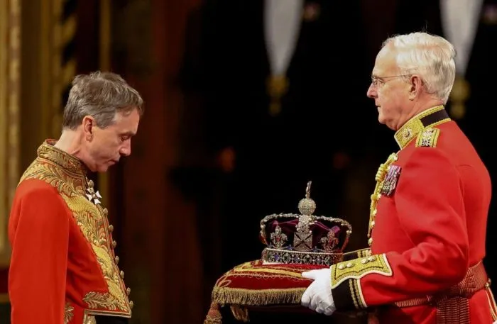 La couronne impériale d'État est sortie du Parlement lors de l'ouverture solennelle du Parlement, au palais de Westminster, dans le centre de Londres, le 25 mai 2010.