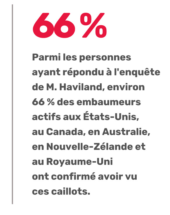 M. Haviland a envoyé des questionnaires, via Survey Monkey, à des salons funéraires aux États-Unis, au Canada, en Australie, en Nouvelle-Zélande et au Royaume-Uni. Sur les 179 embaumeurs actifs qui ont répondu à l’enquête, 119 auraient confirmé avoir vu ce type de caillots.