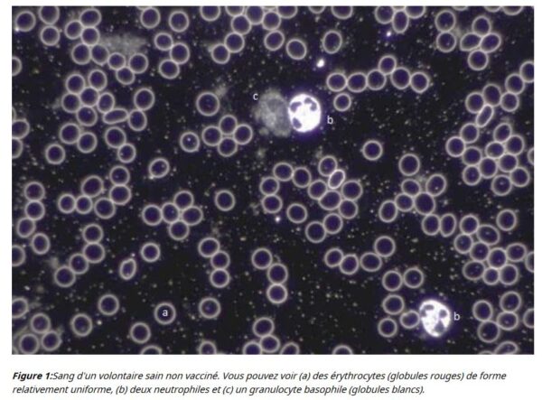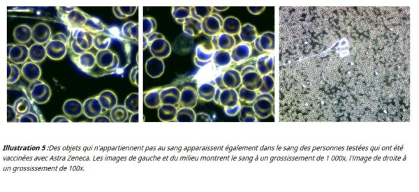 Une autre caractéristique des échantillons de sang vacciné était la dégradation du sang lui‑même. Le rapport fournit des images d’analyse de cellules sanguines vivantes montrant les membranes cellulaires d’érythrocytes (globules rouges ressemblant à des disques concaves) déformées et note une « désintégration inhabituellement rapide des différents types de cellules dans le sang vacciné ». De telles déformations cellulaires ne sont généralement observées que chez les malades chroniques et les personnes atteintes de maladies dégénératives graves.