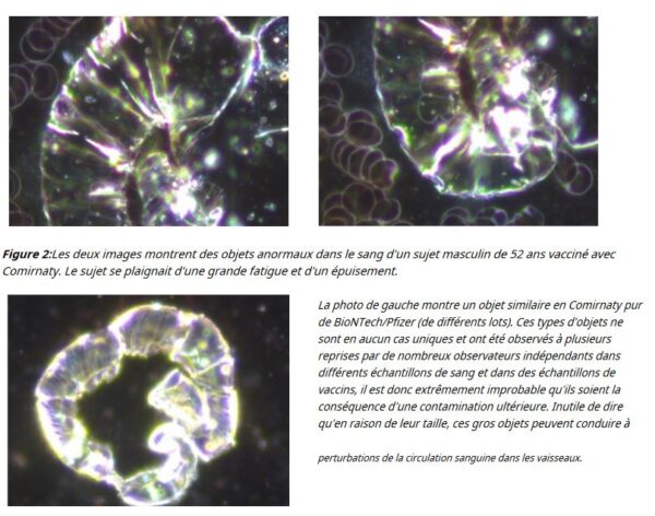« Ce type de structures n’a jamais été trouvé dans le sang humain auparavant. Ces structures ont été trouvées le plus souvent dans le vaccin Comirnaty de BioNTech/Pfizer », peut‑on lire dans le rapport.
