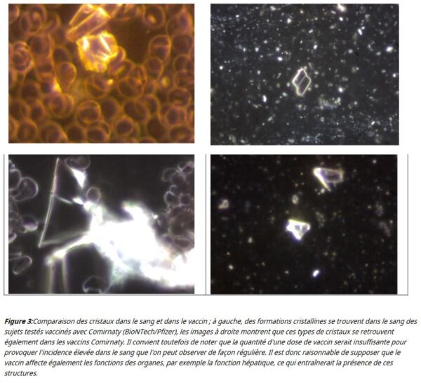 En plus d’analyser les flacons de vaccins, les chercheurs du GWG ont analysé le sang des personnes vaccinées et l’ont comparé à des échantillons de sang de personnes non vaccinées. Ils ont constaté que le sang de tous les patients vaccinés testés (plus précisément ceux ayant reçu les vaccins Pfizer/BioNTech ou Moderna) présentait des « structures nouvelles », telles que des cristaux rectangulaires et des spirales.