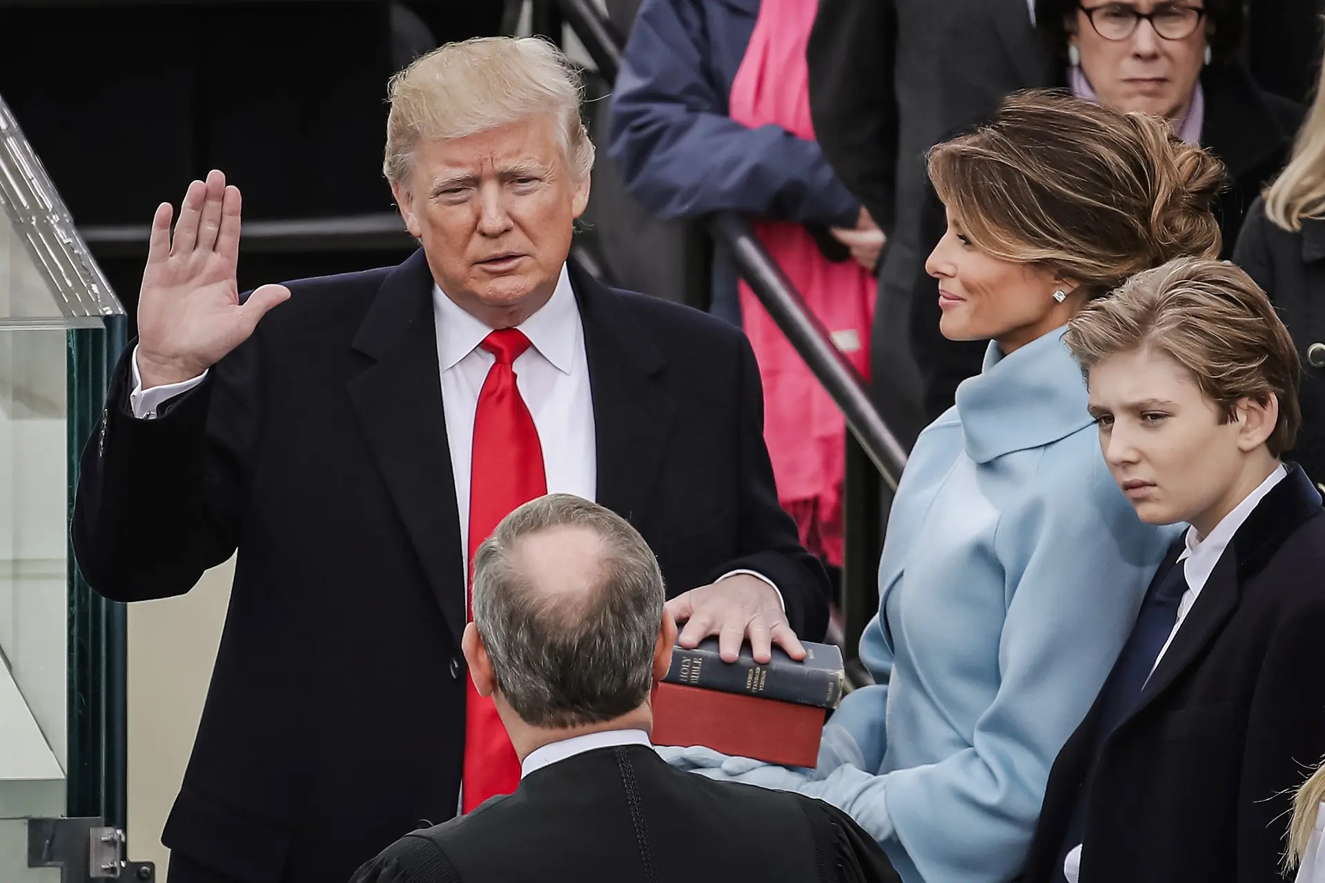 (En haut) Le président Donald Trump prête serment alors que sa femme Melania Trump tient la Bible, devant le Capitole des États-Unis, le 20 janvier 2017. (En bas à g.) Palmer Luckey, cofondateur d’Anduril, soutient depuis longtemps l’ancien président Trump. (En bas au milieu) Le capital-risqueur David Sacks a coorganisé une collecte de fonds pour Donald Trump dans le monde de la tech le 6 juin. (En bas à d.) L’investisseur en capital-risque Chamath Palihapitiya était l’autre coorganisateur de la collecte de fonds du 6 juin. M. Palihapitiya a déjà fait des dons importants aux Démocrates par le passé. (Drew Angerer/Getty Images, Patrick T. Fallon/AFP via Getty Images, Steve Jennings/Getty Images pour TechCrunch, Mike Windle/Getty Images pour Vanity Fair)