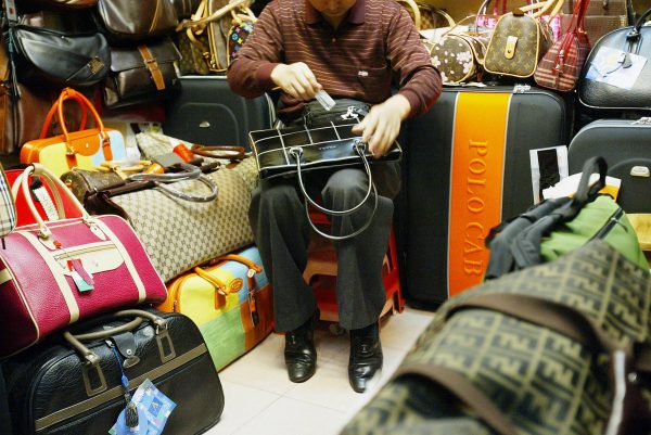 Un commerçant polit un faux sac Prada au milieu d’autres articles contrefaits dans son magasin dans la ville de Guangzhou, le 18 novembre 2004. (Laurent Fievet / AFP / Getty Images)