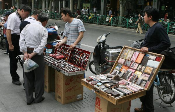 Des vendeurs de rue avec des montres contrefaites et de faux portefeuilles de marques de luxe en face d’un grand magasin à Shanghai, Chine, le 23 mai 2007. (Mark Ralston / AFP / Getty Images)