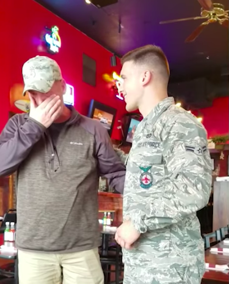 Alors que Jeff terminait de commenter la météo, deux jeunes hommes ont ouvert la porte du restaurant et ont attiré son attention. Sa mâchoire est tombée en état de choc. Il a rapidement jeté un coup d’œil à sa femme, puis de nouveau vers eux. Melanie a tourné la caméra pour filmer deux hommes, tout souriants, en uniforme, s’approchant de leur table.
