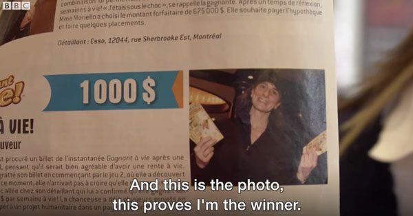 En 2013, Rachel Lapierre, âgée de 55 ans a gagné 1000 $ (650 euros) à vie en jouant à la loterie du Québec au Canada.